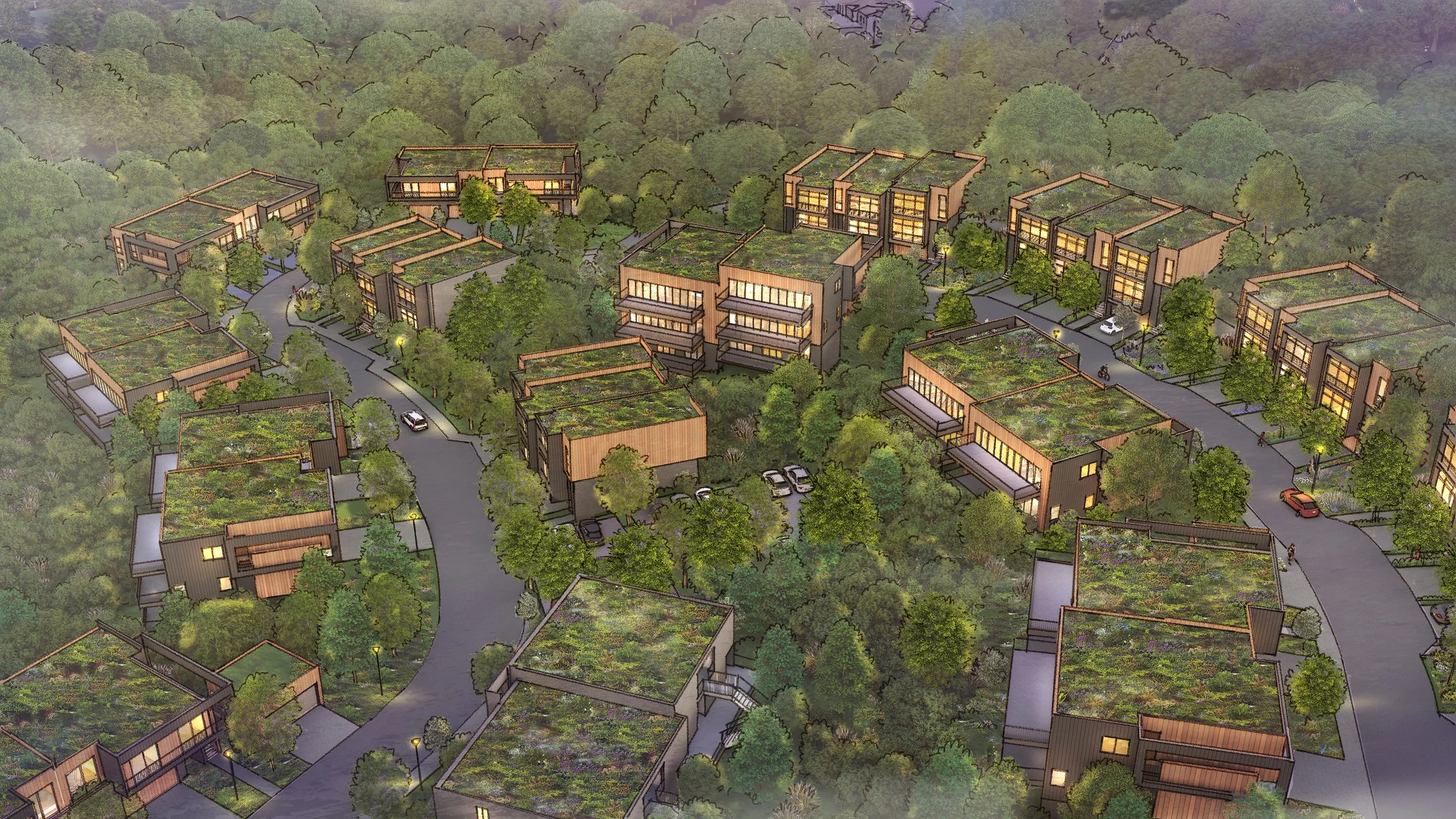 The 220,000 square-foot build-out is distributed to preserve tree canopies, enhance privacy, and maintain a village-like scale—proving that high density and livability are not mutually exclusive.